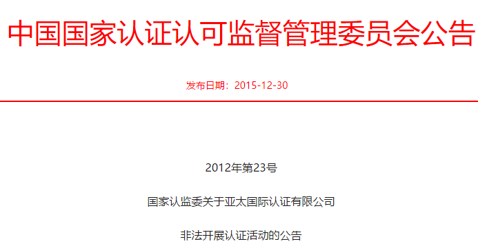 据认监委官网,2012年9月20日,认监委发布2012年第23号公告,经查证,亚太国际认证有限公司未经国家认监委批准,擅自在中国境内从事认证活动并颁发质量管理体系认证证书。其行为违反了《中华人民共和国认证认可条例》的规定,属非法认证。