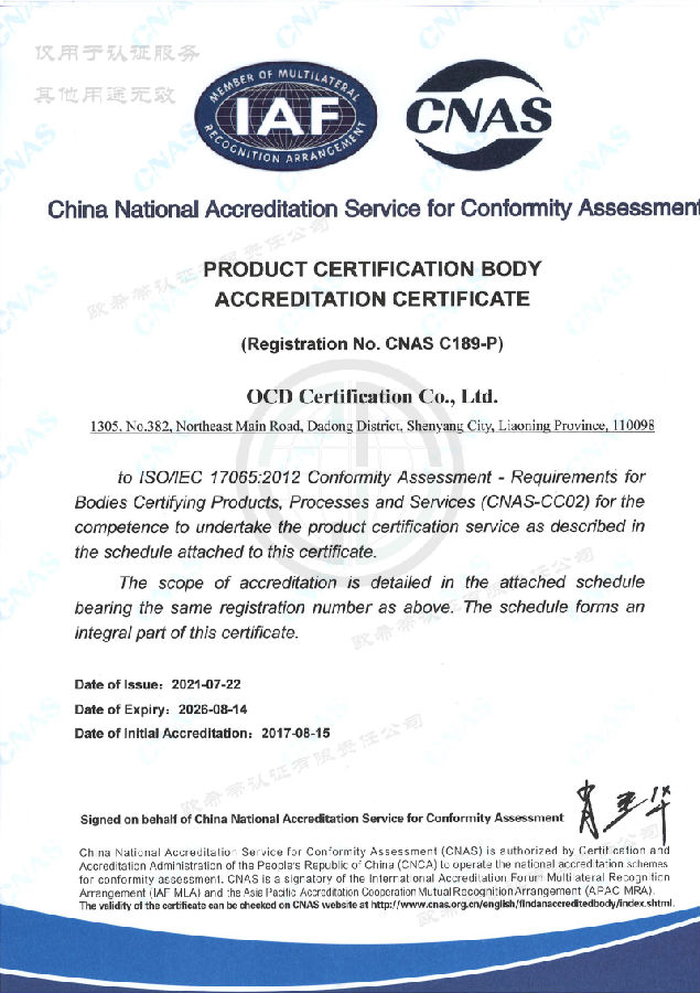 产品认证机构认可证书(英文)