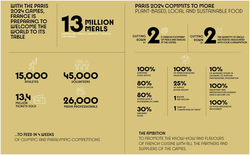 巴黎奥运会期间将提供超过1300万份餐食——相当于10场世界杯足球赛提供的餐食量——是世界上最大的活动餐饮业务。完整的餐饮物流服务可确保每天提供约4万份餐食。奥运餐食的重点放在本地采购上,80%的菜单食材来自法国境内,25%来自巴黎250公里半径范围内。这不仅确保了新鲜度和质量,而且还支持了当地农业,并减少了与食品运输相关的碳足迹。