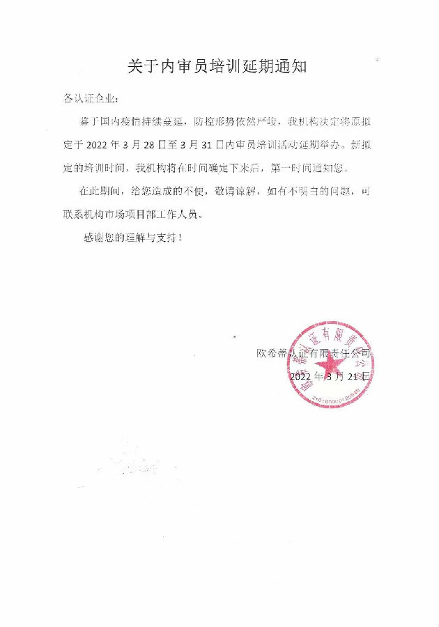 2022年内审员培训延期通知
