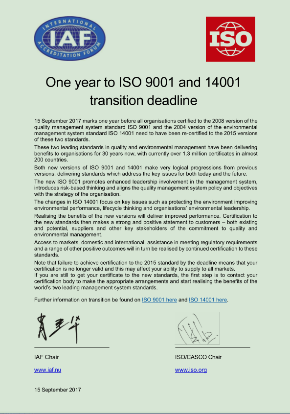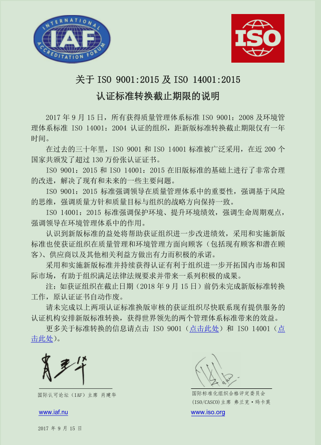 为积极贯彻中共中央、国务院《关于开展质量提升行动的指导意见》、质检总局和国家认监委《关于广泛开展新版质量管理体系标准宣贯活动加强全面质量管理的通知》以及国家认监委《关于开展打造质量管理体系认证升级版试点工作的通知》等文件要求,同时响应国际认可论坛(IAF)主席和国际标准化组织合格评定委员会(ISO/CASCO)主席《关于ISO 9001:2015 及1SO 14001:2015 认证标准转换截止期限的说明》的联合倡议,请各获证组织按照中国合格评定国家认可委员会(CNAS) 发布的《关于ISO 9001:2015 及ISO 14001:2015 认证标准换版的认可转换说明》要求,积极组织在新版认证标准转换截止期限(2018年9月15 日)前完成新版标准的认证转换工作,为全面提升产品和服务质量做出贡献。