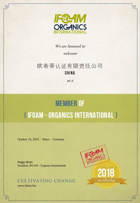IFOAM世界会员,既是荣誉与认可,也是责任与挑战。欧希蒂认证有限责任公司将秉承IFOAM健康、生态、公平、关爱的原则,坚持公正诚信、专业权威、服务增值、开拓创新的经营理念,为全球有机事业尽绵薄之力。