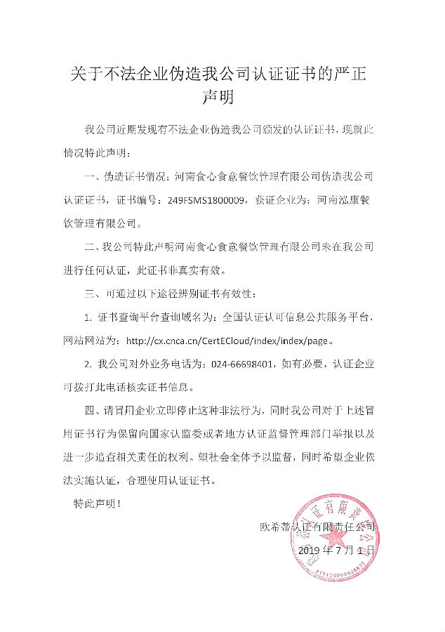 关于不法企业伪造我公司认证证书的严正声明
