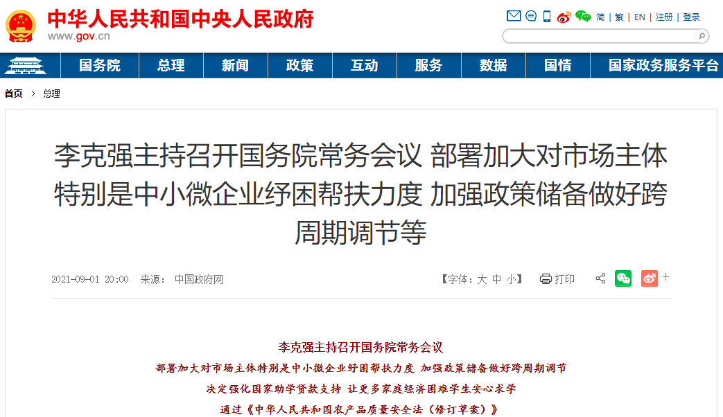 9月1日,李克强主持召开国务院常务会议,通过《中华人民共和国农产品质量安全法(修订草案)》。
